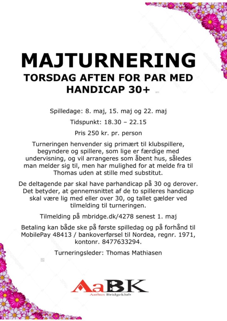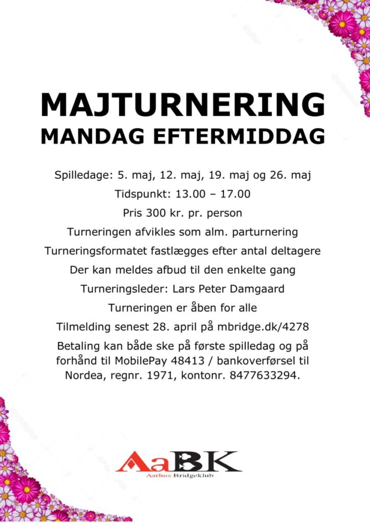 Aarhus Bridgeklub afholder igen i år 4 majturneringer som afslutning på sæsonen.